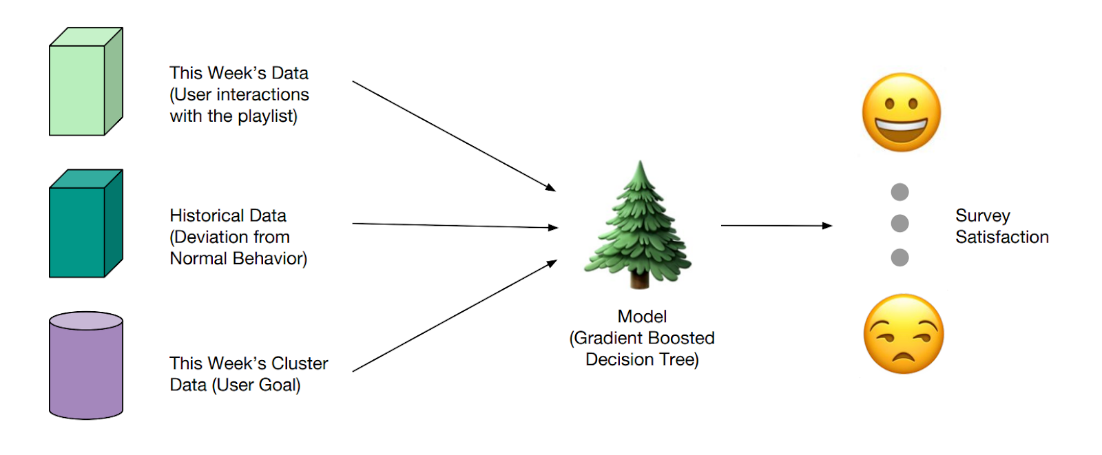 Finally, in some cases, Spotify employs yet another set of algorithms just to devise the reward functions for a specific feature. For example, Spotify has trained a separate ML model to predict user satisfaction with Discover Weekly (with the training set sourced by user surveys). This model would look at the entire wealth of user interaction data, past Discover Weekly behavior, and user goal clusters (i.e., if the user engaged with Discover Weekly as background, to search for new music, save music for later, etc.) — and then produce a unified satisfaction metric based on all that activity.