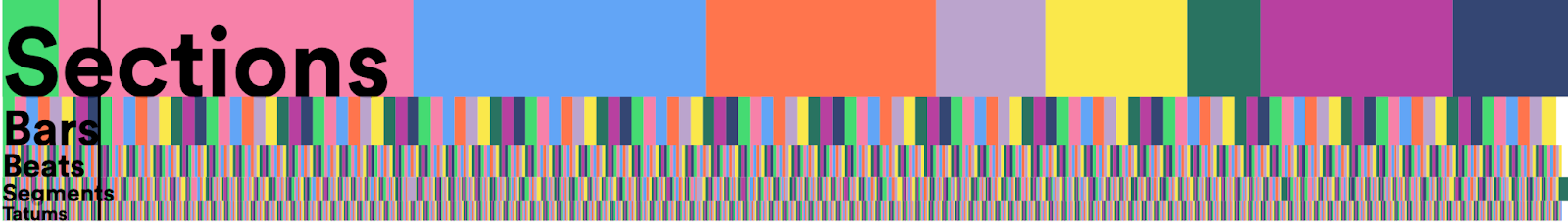 Yet, these audio features are just the first component of Spotify's audio analysis system. In addition to audio feature extraction, a separate algorithm will also analyze the track's temporal structure and split the audio into different segments of varying granularity: from sections (defined by significant shifts in timbre or rhythm that highlight transitions between key parts of the track such as verse, chorus, bridge, solo, etc.) down to tatums (representing the smallest cognitively meaningful subdivision of the main beat).